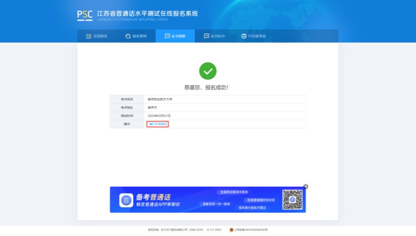 9.打印准考证。从报名成功页面操作栏或菜单栏中“打印准考证”,自行打印准考证。