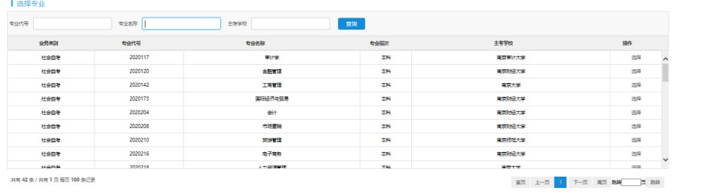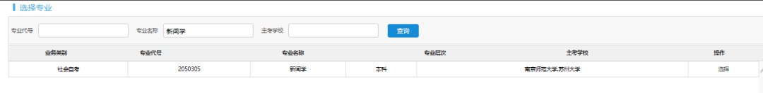 可以通过检索“专业代码”、“专业名称”、“主考学校”进行查找,找到报考的专业,点击“选择”。