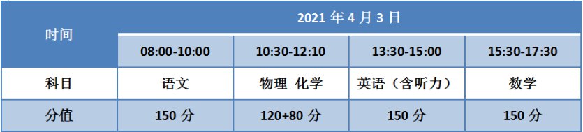 请考生于2021年4月3日7:30前到达学校3号门,携带好必要的文具(如2B铅笔、橡皮等,详见准考证笔试须知)凭准考证、身份证或户口本进入校园。