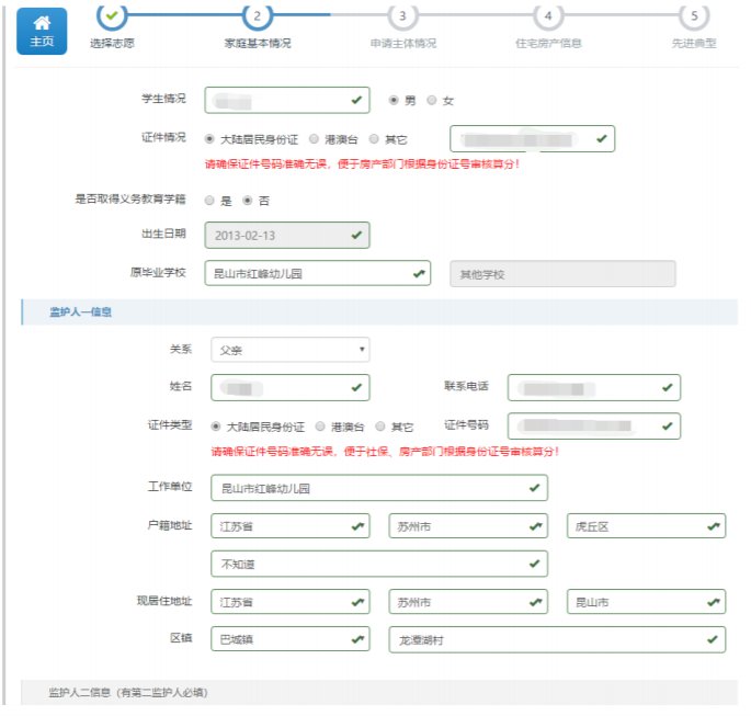 ②监护人信息,一般为父母,如有第二监护人,监护人二信息则必填。若已有子女报名,待填写第二子女信息时,监护人信息不可更改。