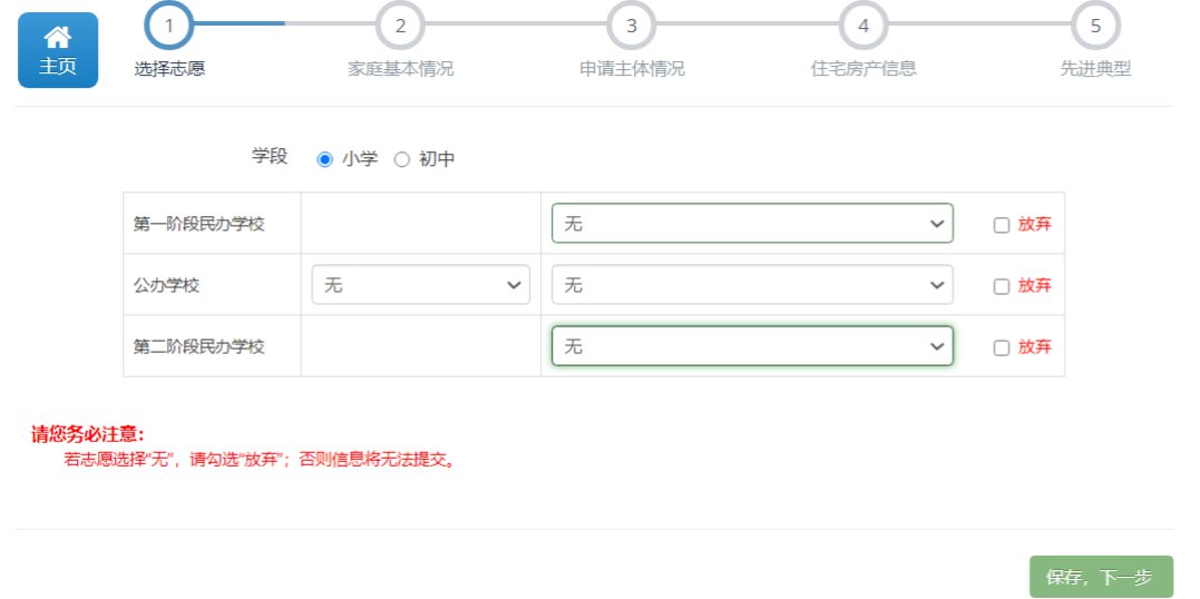 选择志愿:新市民填报页面分“第一阶段民办学校”“公办学校”“第二阶段民办学校”三个志愿批次,家长可以依次选择填写相应想就读的学校,依次录取。志愿填报可以只填一所,或者都填,视情况而定。如果放弃某一志愿,需要勾选 “放弃”后才能提交。