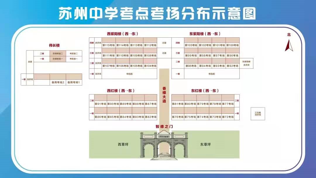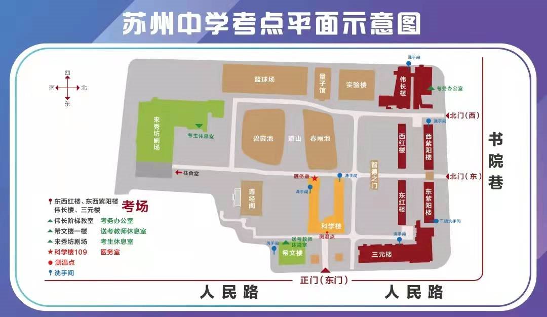 考生一律从人民路699号苏州中学东校门进入考点,书院巷北校门离开考点,因人民路地处交通主干道,为保障考试顺利,避免交通拥堵,建议考生和送考家长绿色出行。接送考生车辆在考生下车后不允许调头,考试期间,人民路、书院巷两侧禁止停车等候考生,请送考家长合理规划接送方式,请勿在校门口长时间逗留。