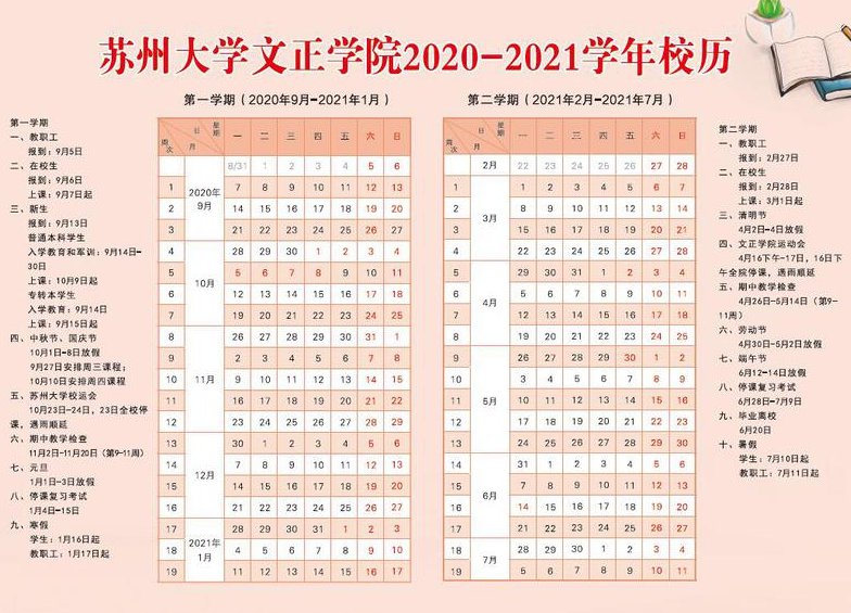 2020-2021年第一学期苏州大学上课时间是于1月15日(星期五)结束,1月16日(星期六)开始放寒假,2月27日回校报道,2月28日新学期开始,总共有43天的假期。