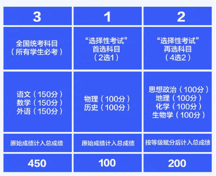考生首先从历史、物理2门科目中选择1门作为首选科目,再从思想政治、地理、化学、生物4门科目中选择2门作为再选科目。