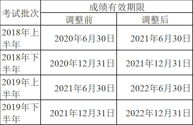 参加“2018年上半年至2019年下半年”各批次笔试,已通过的单科笔试科目成绩有效期延长1年,即成绩有效期由2年延长至3年,成绩查询网站页面会及时更新有效期限。参加“2017年下半年批次(含)之前”单科笔试科目成绩有效期已于2019年12月31日前终止,因此不再延长。
