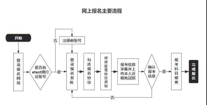 网上报名需要ETEST通行证账号,该账号在教育部考试中心所有使用ETEST通行证的报名系统中通用。若考生已有ETEST通行证,则直接登录报名;若没有该账号,需要先进行账号注册后再进行报名。