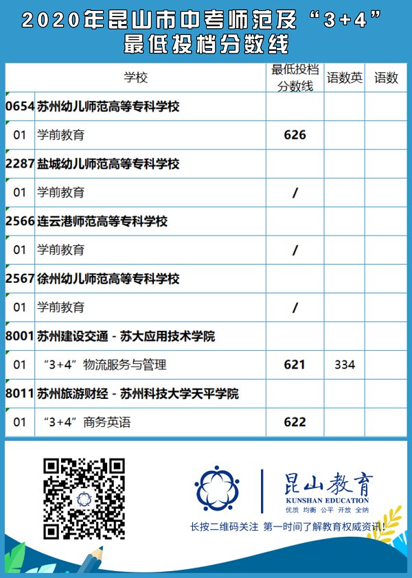 2020昆山中考师范及3+4最低投档分数线(2020年中考昆山各学校录取分数线)