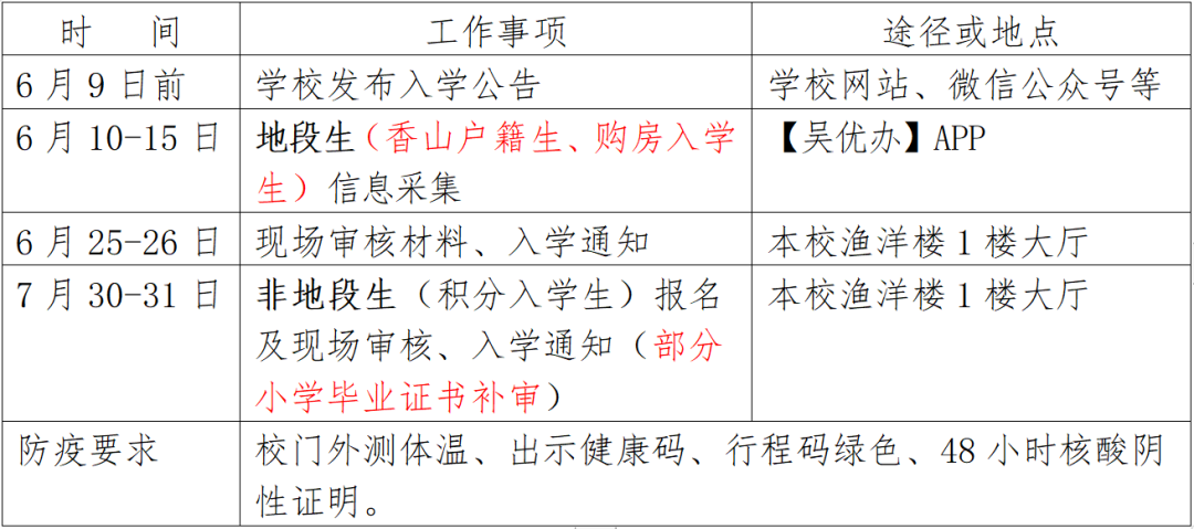 要求:符合《苏州市义务教育阶段流动人口随迁子女积分入学实施细则》规定。持“积分入学通知单”,携带户口簿、小学毕业证书、素质发展报告书等,到本校现场审核。