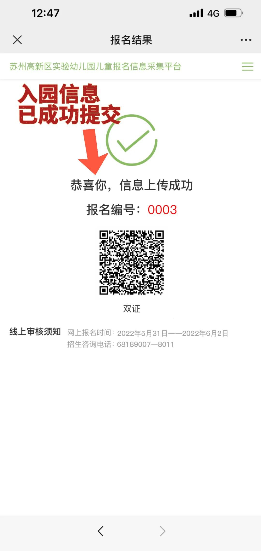 (*)信息提交后,等候幼儿园验证报名信息,将以短信通知现场审核时间。