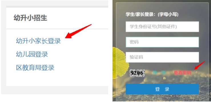 点击“幼升小家长登录”进入,首次登录,直接重置密码。
